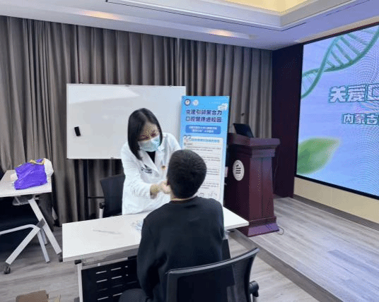 在口腔义诊环节,内蒙古医科大学口腔医学院党员教师团队在生物楼三楼智慧教室为学院师生提供口腔健康检查、普及口腔健康知识和咨询诊疗服务,以实际行动践行“我为群众办实事”的初心使命。
